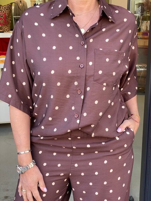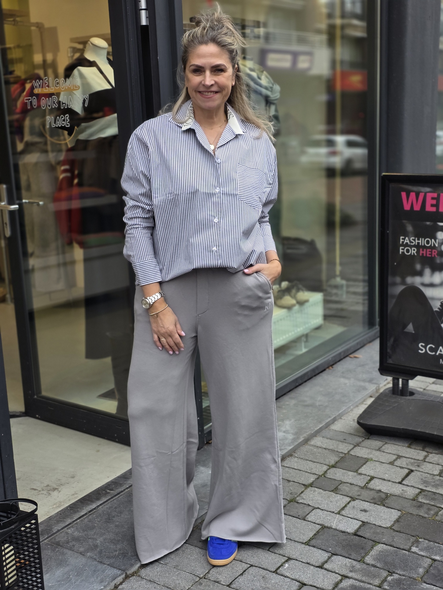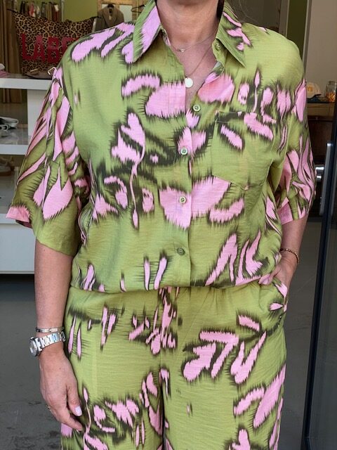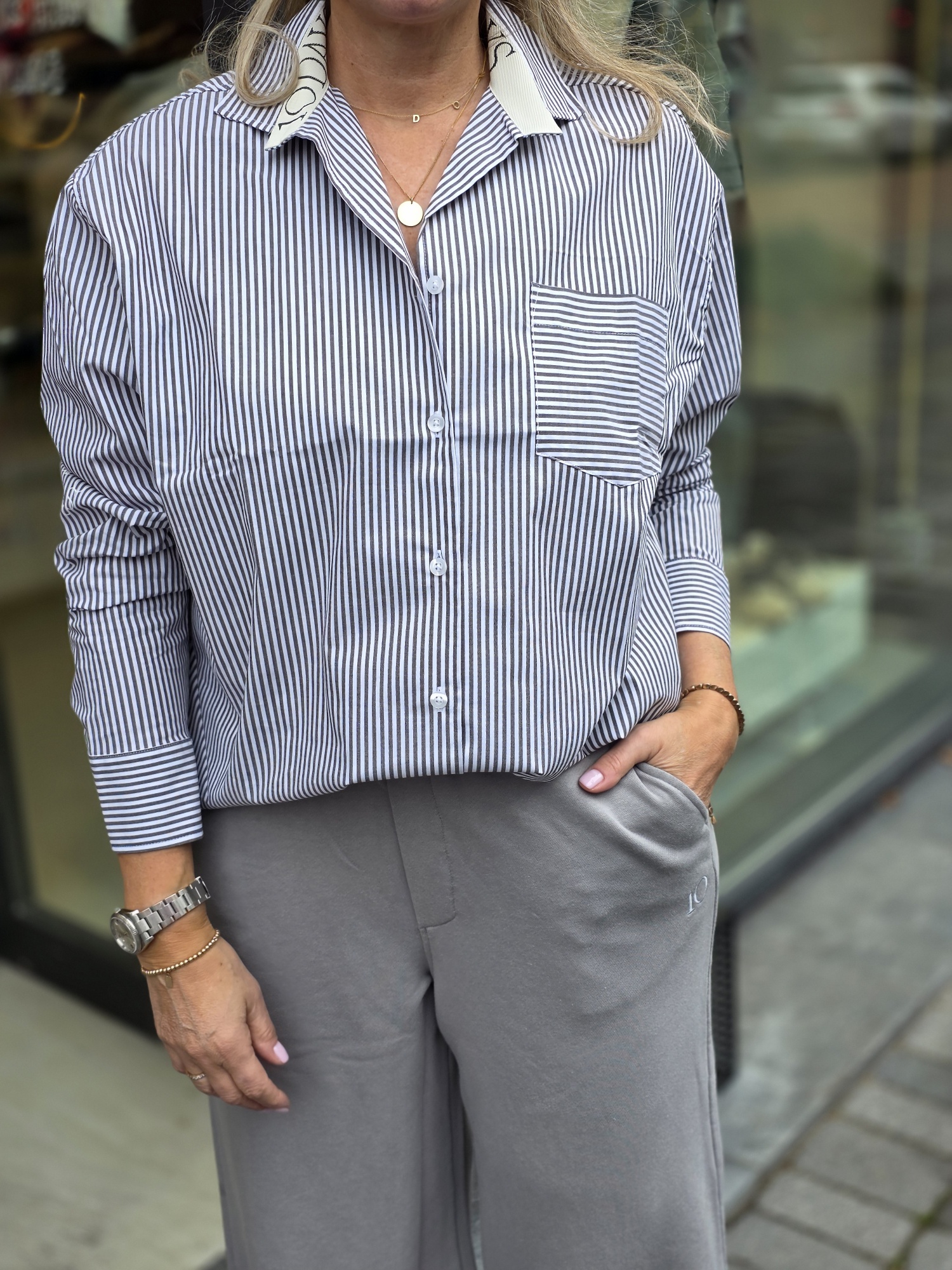 Relaxed fit blouse met strepen, gemaakt van GOTS-gecertificeerd biologisch katoen. Voorzien van een knoopsluiting, een opgestikte borstzak, manchetten met knoop en een ‘curly 10’ print op beide mouwen. Model draagt maat s.