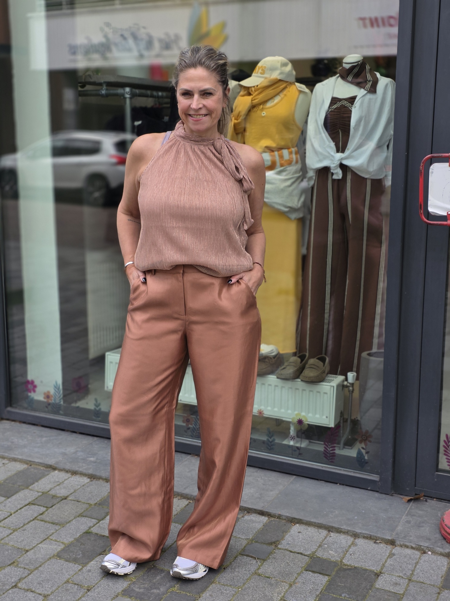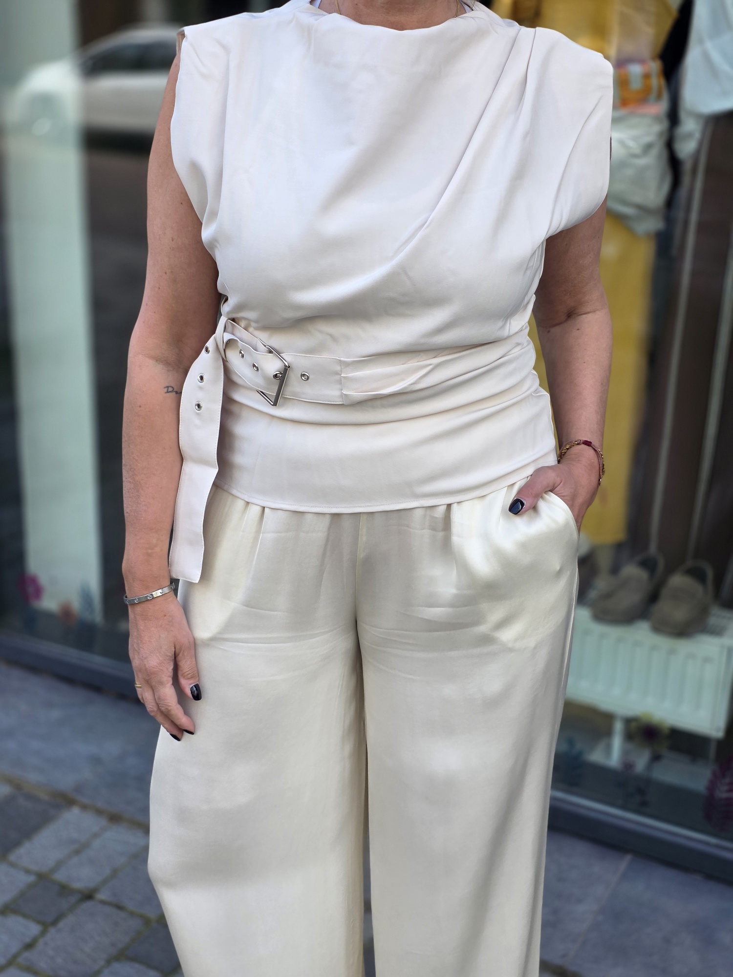 Relaxed fit one-shoulder asymmetrische top, gemaakt van een luchtige linnen-viscoseblend met een achterkant van zacht jersey. Voorzien van een elastische geplooide halslijn, een geplooide ballonmouw met een elastische manchet, een raw-edge zoom en een ‘10’ monogram borduring op de linkermouw. Model draagt maat m.