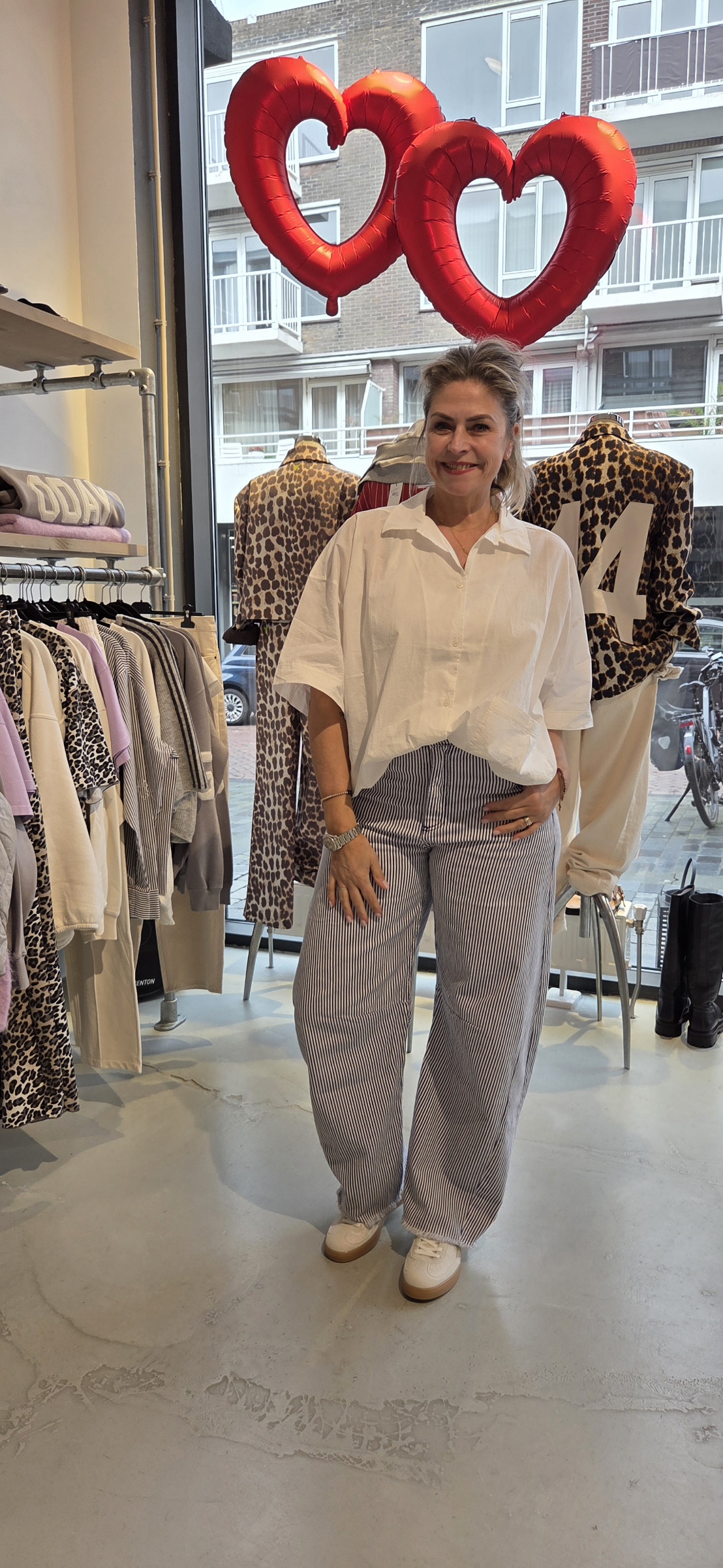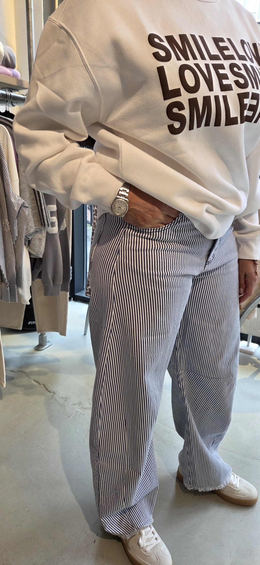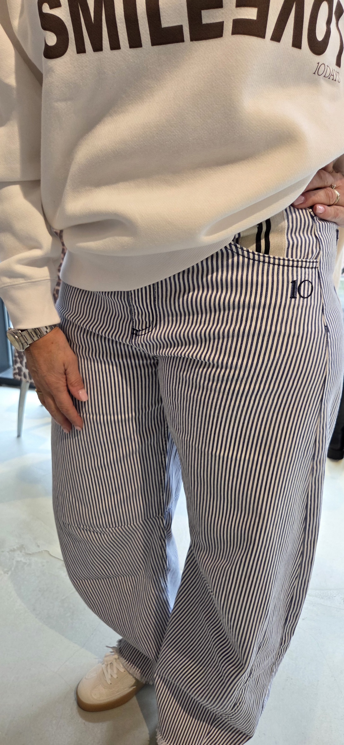 Relaxed fit wide leg western broek met strepen, gemaakt van zacht GOTS-gecertificeerd biologisch katoen. Voorzien van een tailleband met elastiek aan de achterkant en een knoop- en ritssluiting, riemlussen, steekzakken aan de voorkant, opgestikte zakken aan de achterkant, een ‘10’ monogram borduring onder de linker voorzak, hoeknaden op de broekspijpen en een raw edge-afwerking aan de onderkant.