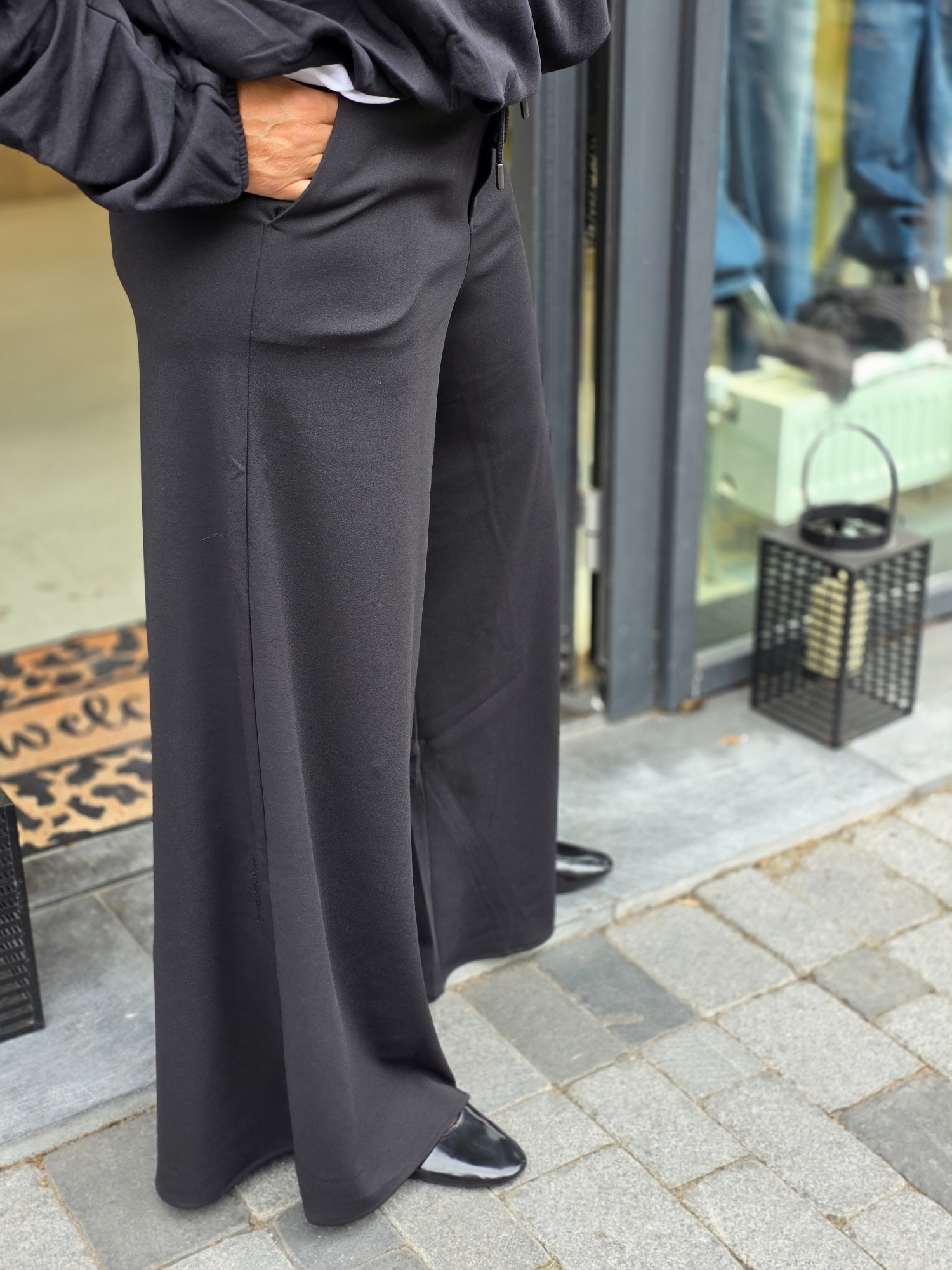 Relaxed fit broek met extra wijde pijpen, gemaakt van zachte stretch crepe. Voorzien van een elastische tailleband met koord en riemlussen, schuine steekzakken, een nep gulp en een ’10’ monogram borduring onder de linker zak. Model draagt maat s.