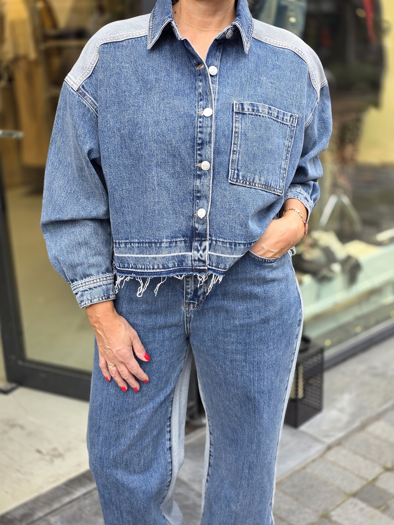 - Ontworpen met twee denimkleuren en een ruwe onderkantzoom.