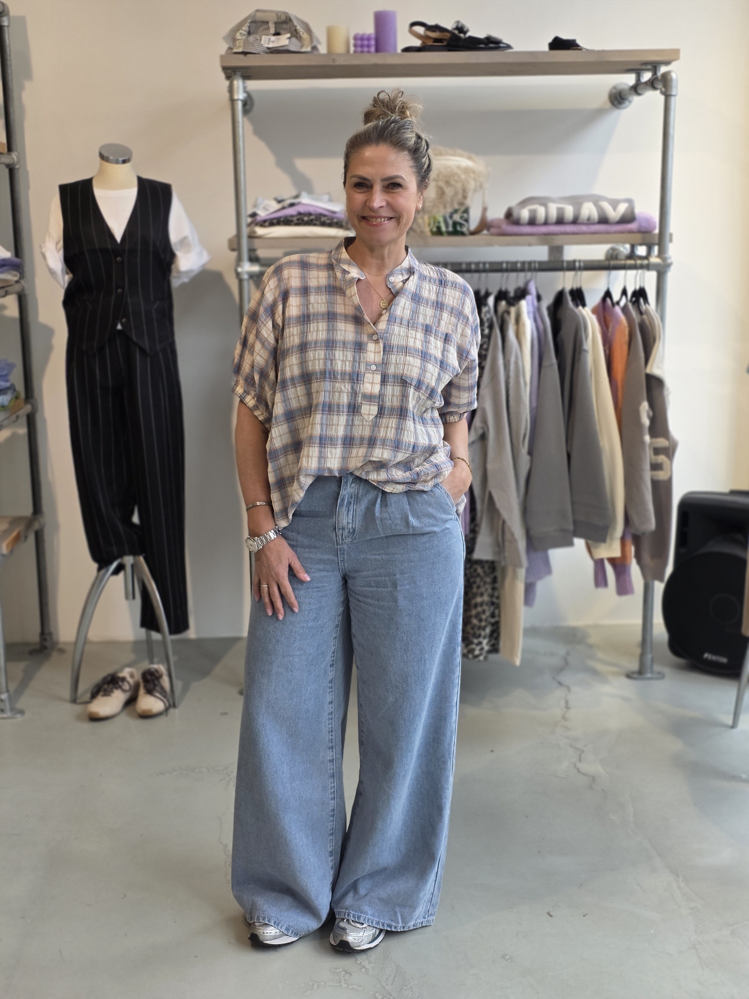 - Korte mouwen blouse gesneden van een zwierige denim stof.