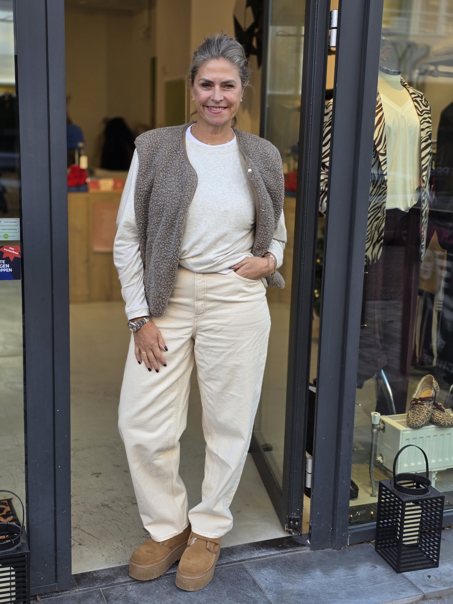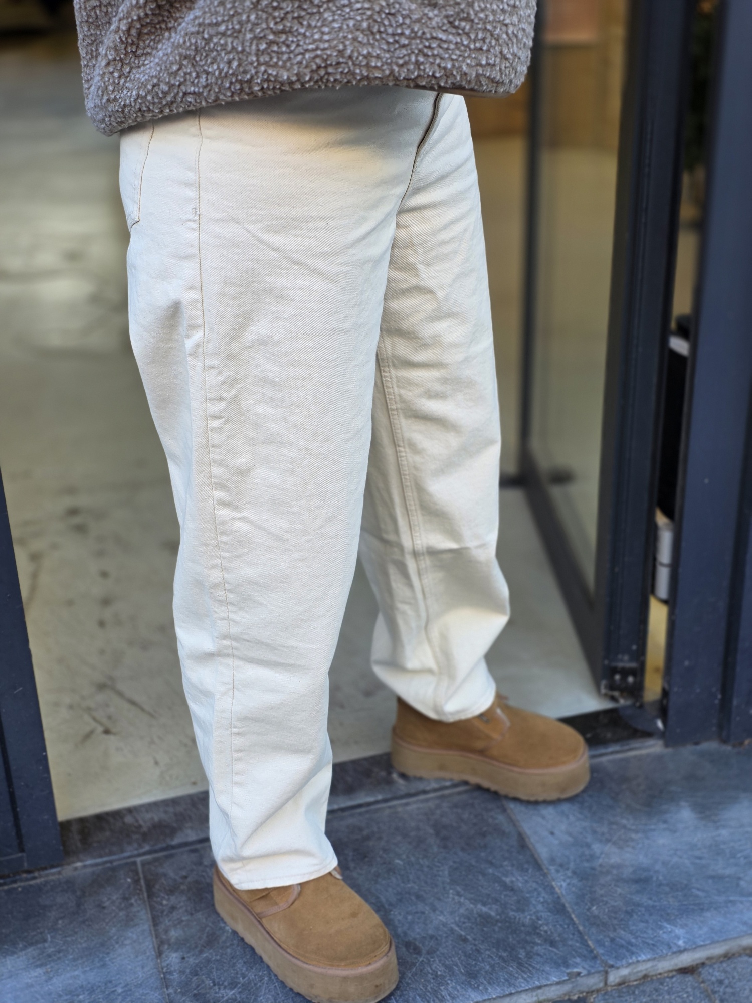 Met zijn lage taille wordt de Snopdog-balloonjeans voor dames op de heupen gedragen als een echte baggy. De balloonpasvorm is wijd bij de dijen en strakker bij de kuiten/onderbenen, wat meer bewegingsvrijheid geeft. Hij is gemaakt van puur ecru katoenen denim en kan worden gedragen in een totale denimlook met het jasje uit dezelfde Snopdog-familie of met breiwerk voor een meer casual look.