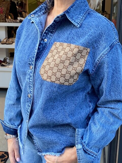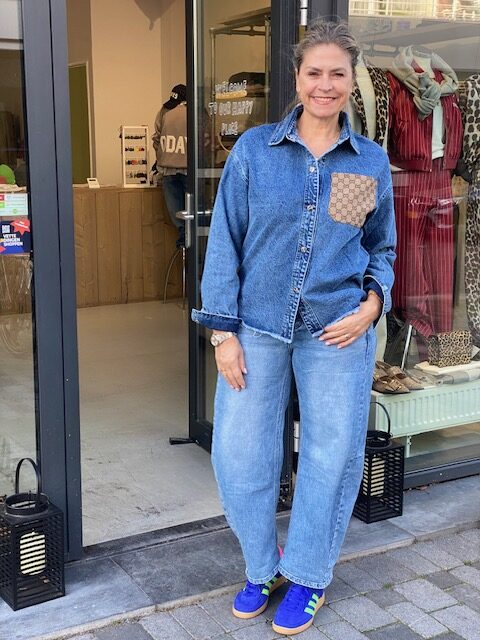 Fijne jeans blouse met zak applicatie. model draagt een s/m