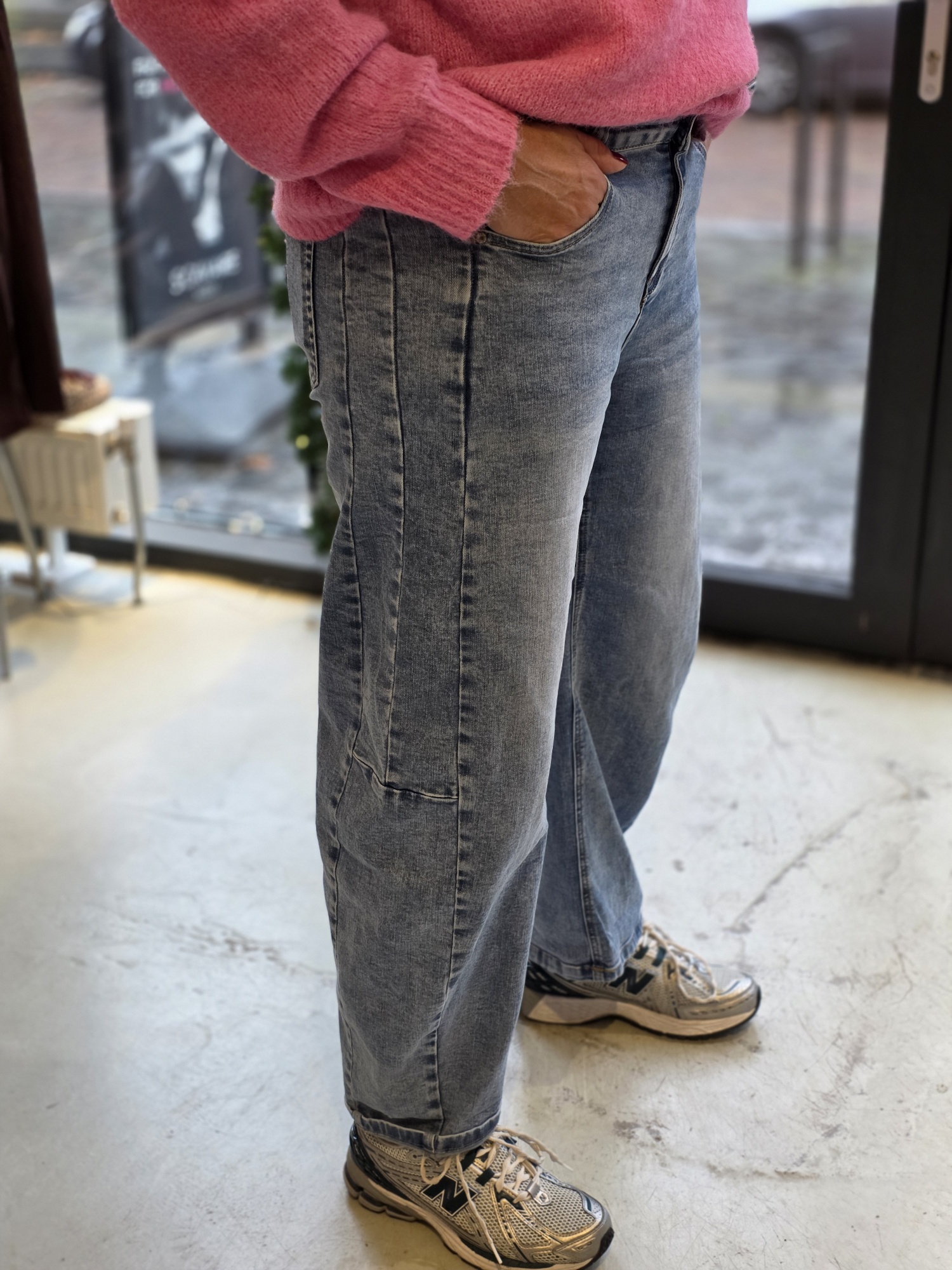 Stoere jeans model barrel, high waist. Model draagt maat m en is 1.75.