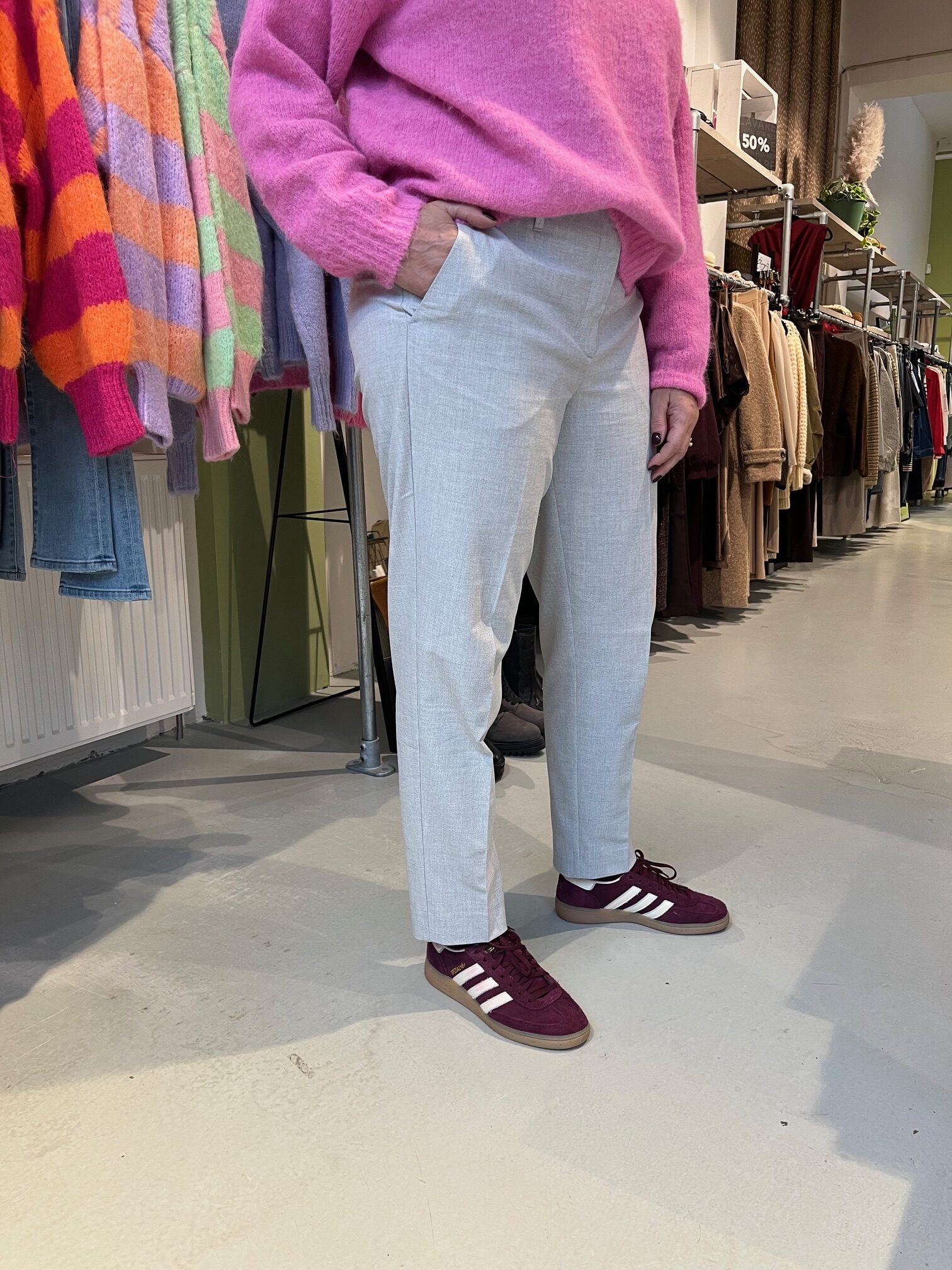 Broek JULIA heeft een hoge taille en een wat smallere, maar wel rechte pijp die valt tot de enkels. In een mooie lichtgrijze kleur, die met aller te combineren valt. Model draagt maat 31.