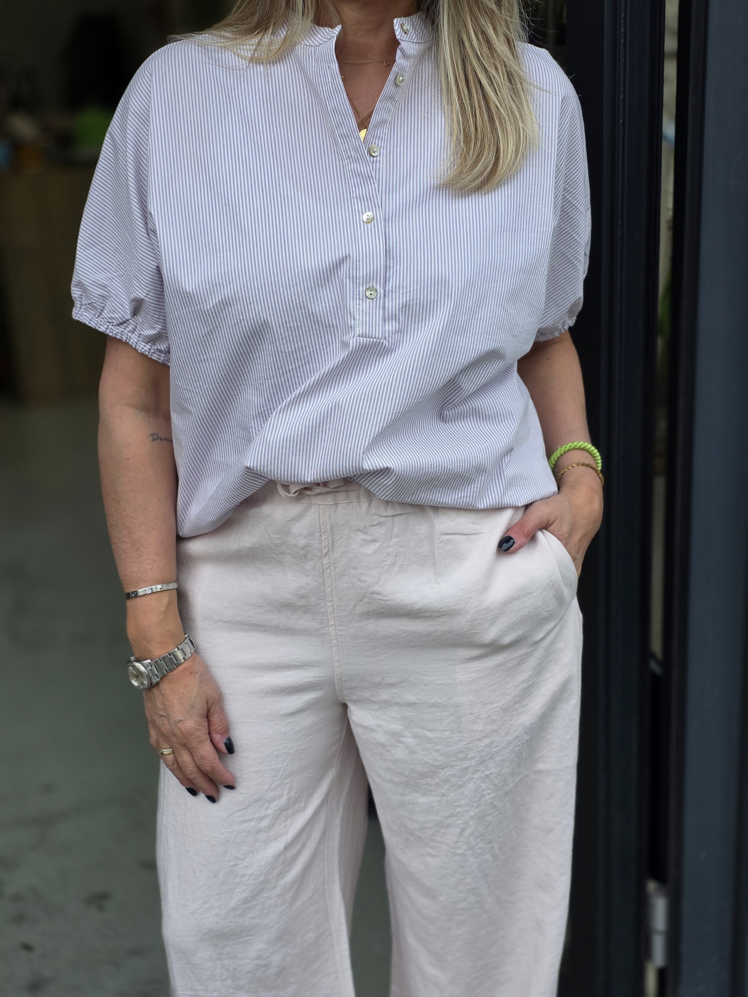Deze verfijnde blouse is gemaakt van een zacht getextureerde stof met een subtiele glans, wat zorgt voor een elegante en gepolijste uitstraling. De ontspannen silhouet wordt aangevuld met door functionaliteit geïnspireerde details, wat een moderne uitstraling toevoegt aan het vrouwelijke ontwerp. Perfect om als set te stylen of op zichzelf te dragen voor een moeiteloos verfijnde outfit.