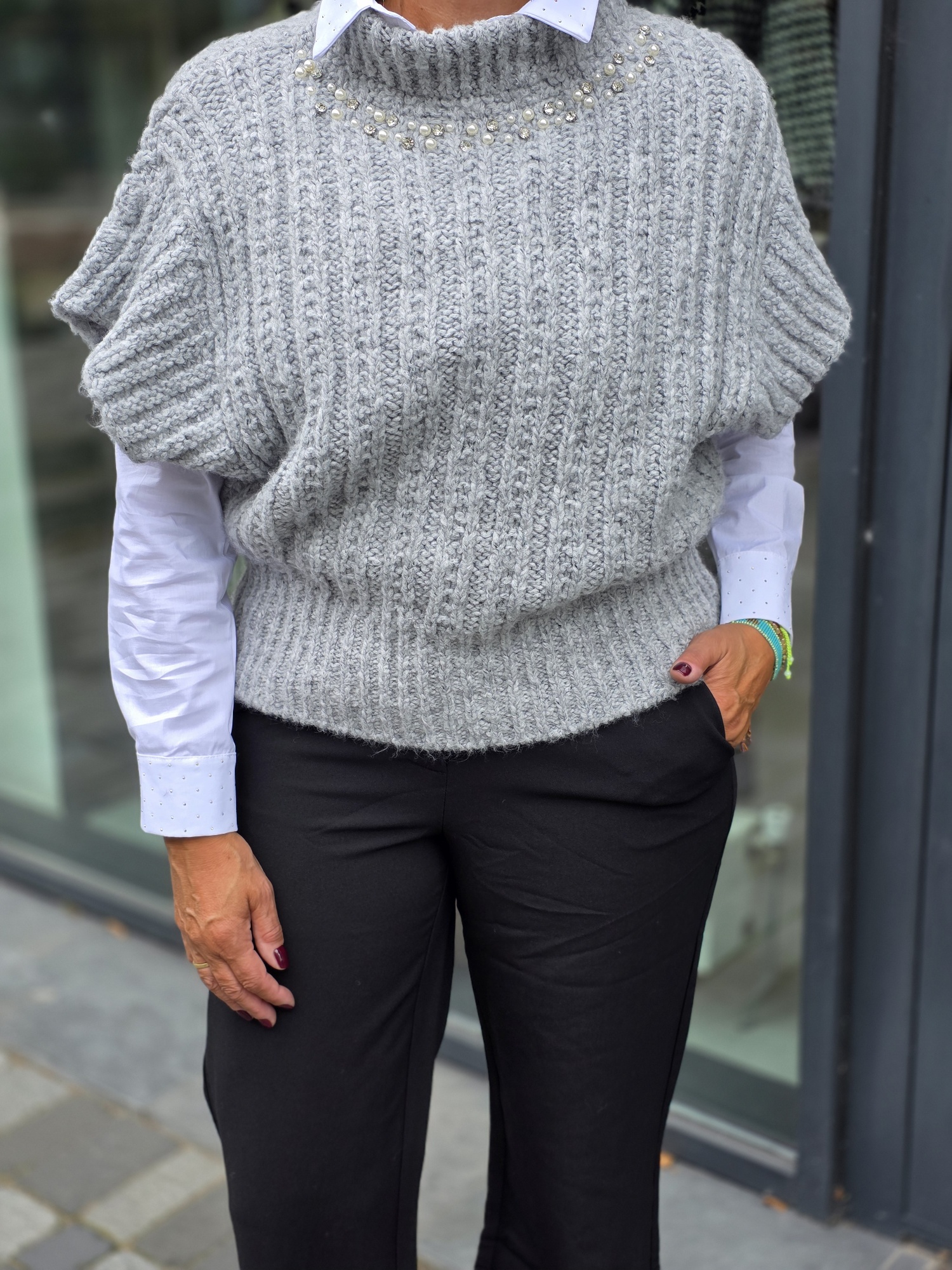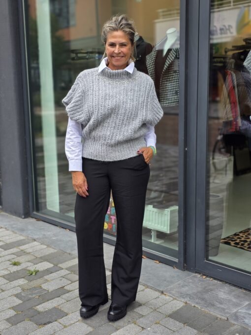 De Kalista Spencer is een eigentijdse, mouwloze knit die moeiteloos stijl en comfort combineert. Gemaakt van een zachte, hairy garenmix, voelt deze spencer warm en luxueus aan. De parel- en steendecoratie langs de halslijn voegt een verfijnde, vrouwelijke touch toe aan het grovere breisel. De hoge col en geribde structuur zorgen voor een moderne, ingetogen look.