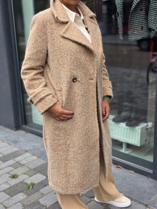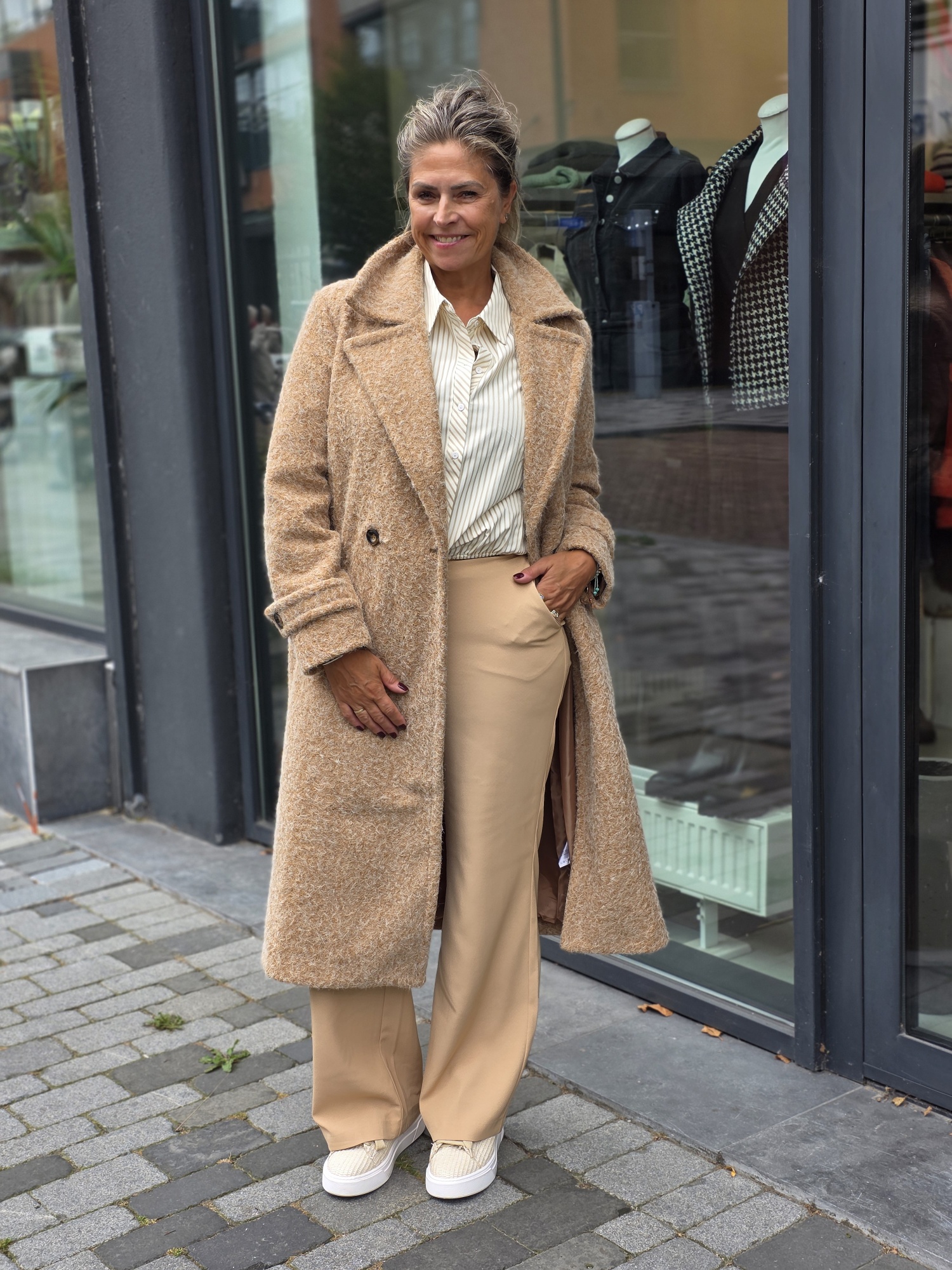 De Odile Coat is een tijdloze, lange jas met een elegante uitstraling. Gemaakt van een zachte hairy polyesterstof, biedt deze jas zowel warmte als structuur. Het single-breasted ontwerp met knoopsluiting en klassieke revers geeft een verfijnde look, terwijl de rechte pasvorm moeiteloos over elke outfit gedragen kan worden.