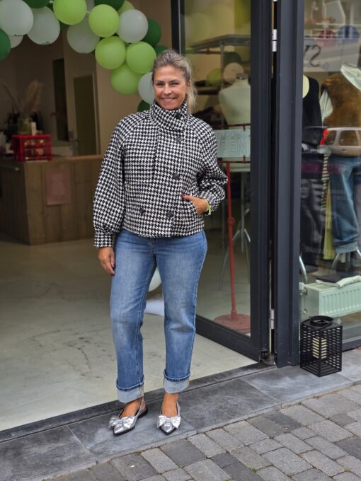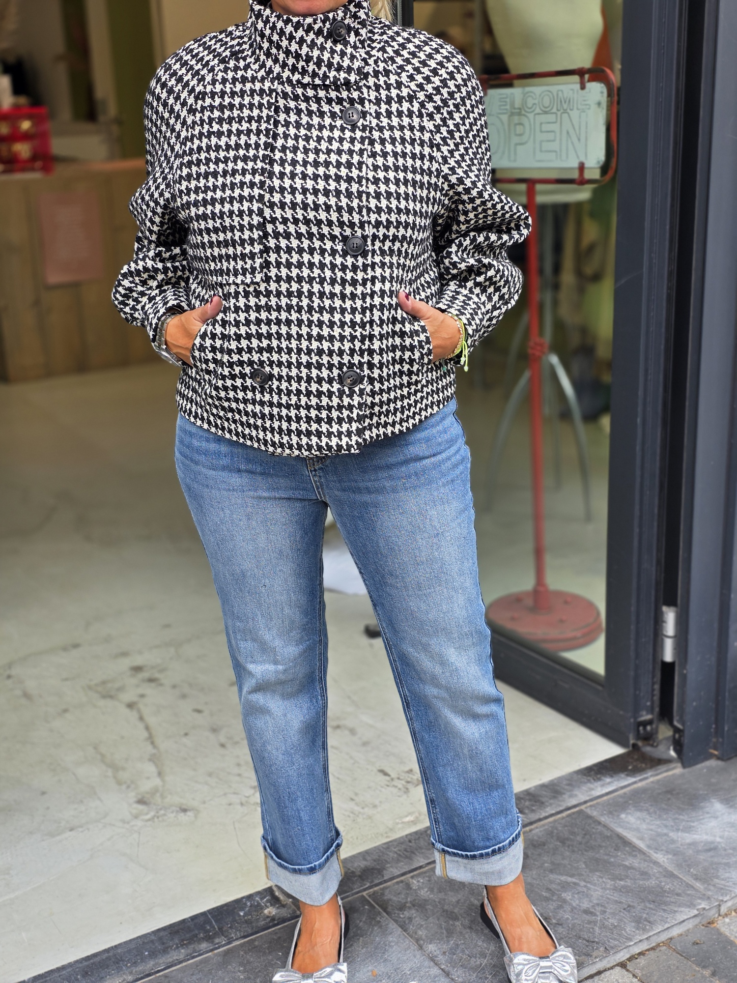 De Ondina Jacket is een opvallende korte jas met een klassieke pied-de-poule print en eigentijdse details. Gemaakt van een warme blend van polyester en wol, combineert dit item stijl met comfort. De double-breasted sluiting, hoge kraag en volumineuze pofmouwen geven het ontwerp een krachtige en vrouwelijke uitstraling.