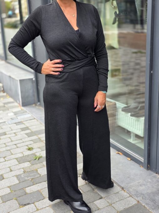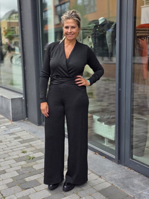 Vervaardigd uit een soepele plissé kwaliteit met subtiele lurex glans, straalt deze jumpsuit moeiteloze klasse uit. De lange mouwen zijn afgewerkt met een fancy detail, wat zorgt voor een verfijnde touch. Dankzij de diepe V-hals en de ceintuur in de taille accentueert het ontwerp op stijlvolle wijze je silhouet, terwijl de wijde pijpen een krachtig maar vrouwelijk silhouet creëren. Perfect voor feestelijke gelegenheden of een chique avond uit.