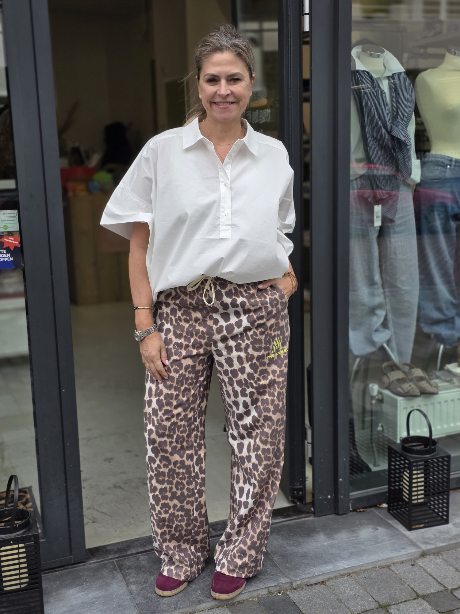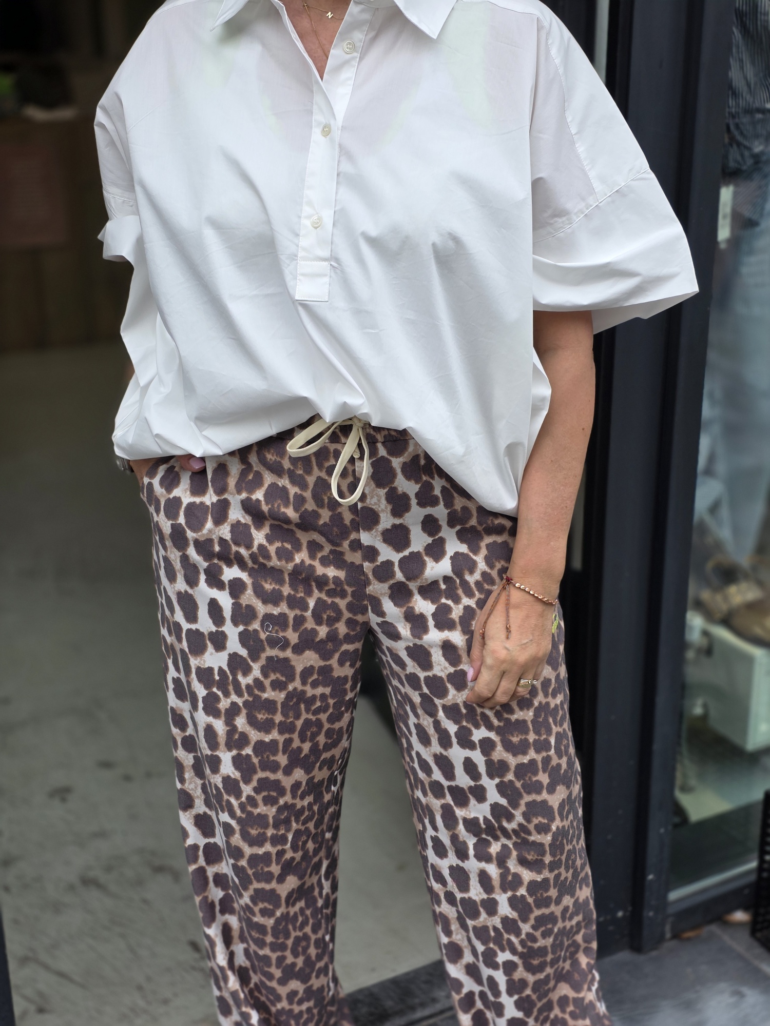 Fijne blouse in een wijd model en korte mouw. Model draagt maat 36