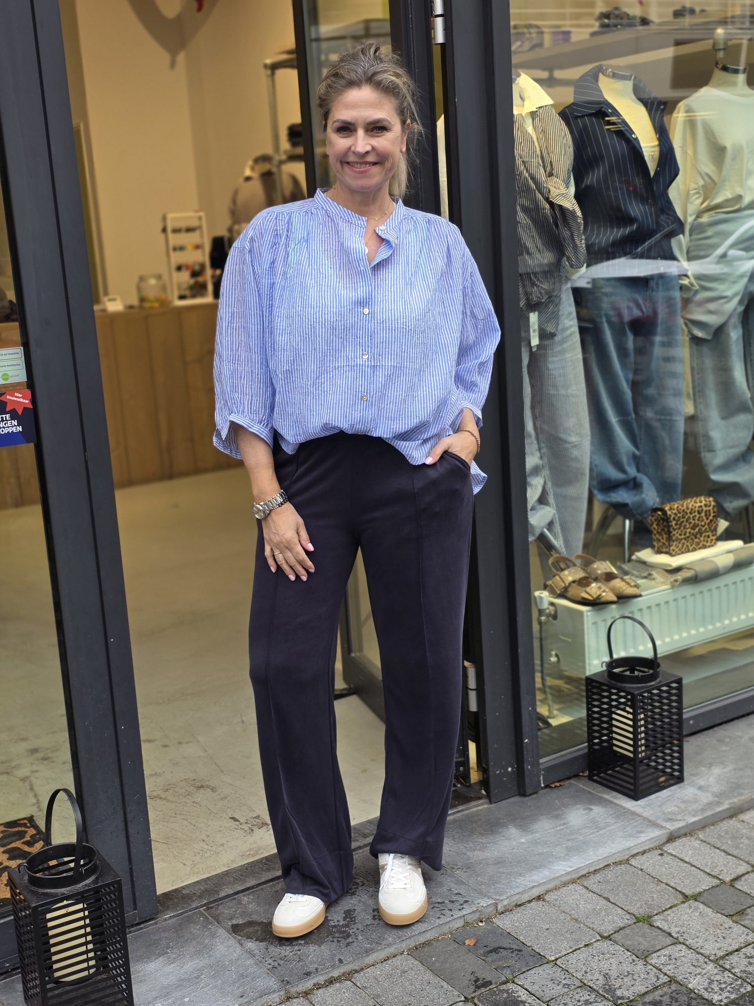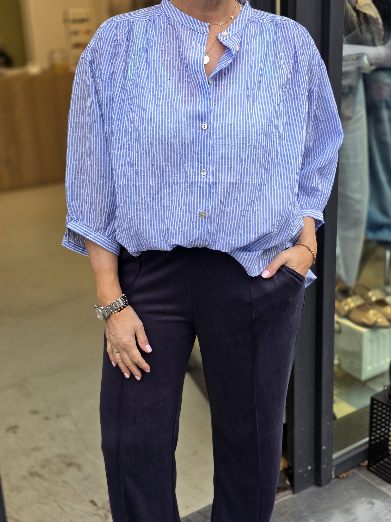 Leuke oversized blouse in een streepje. Model draagt maat 38.