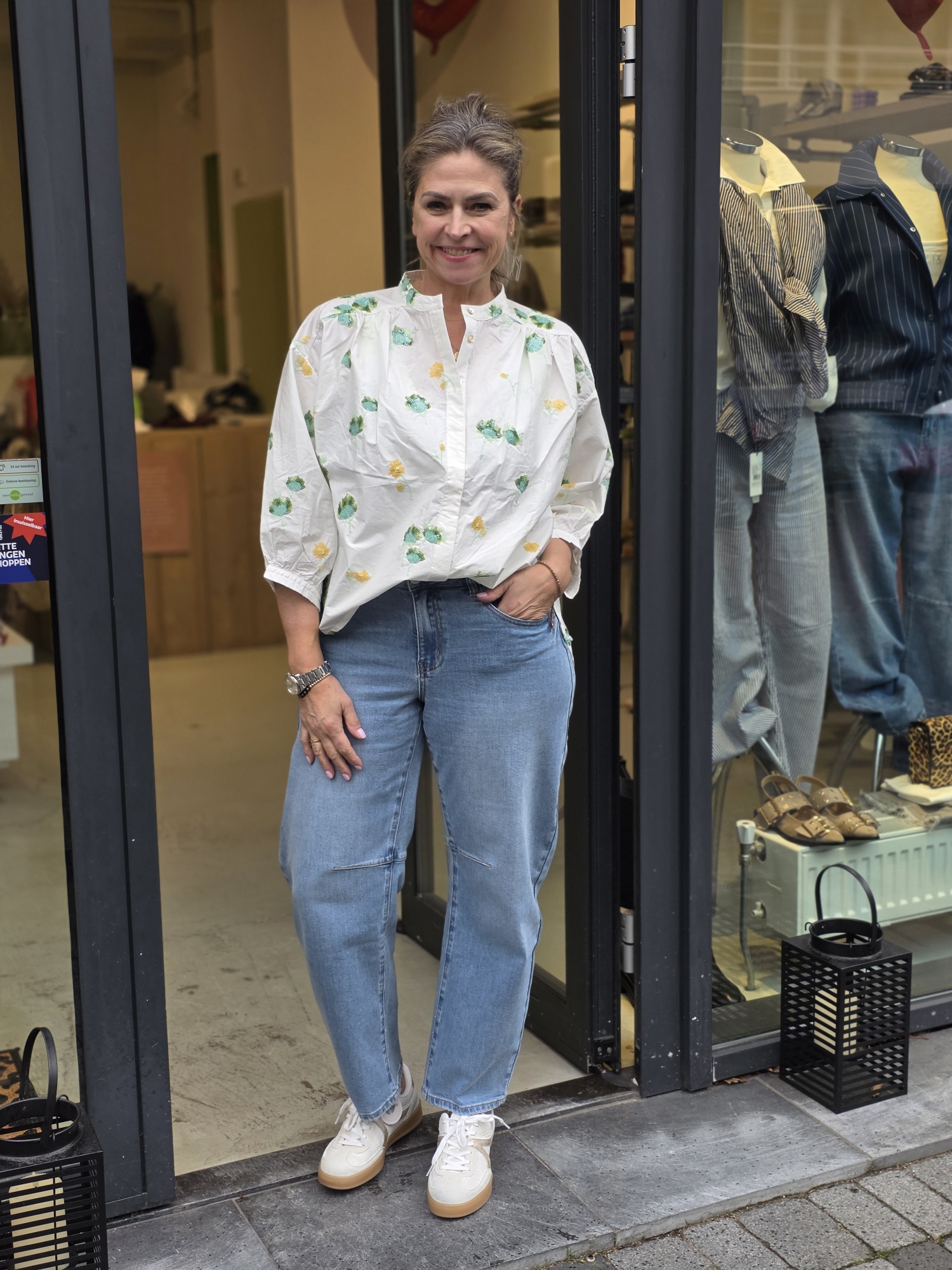 Luna blouse van het merk JC Sophie. Model draagt maat 36