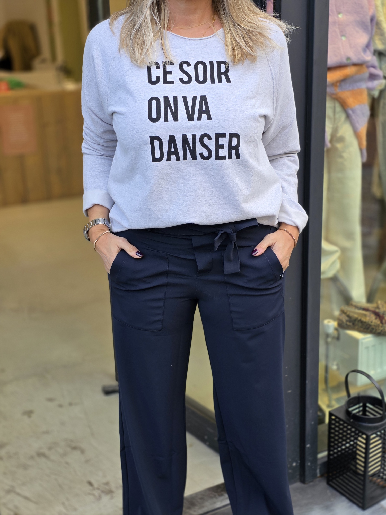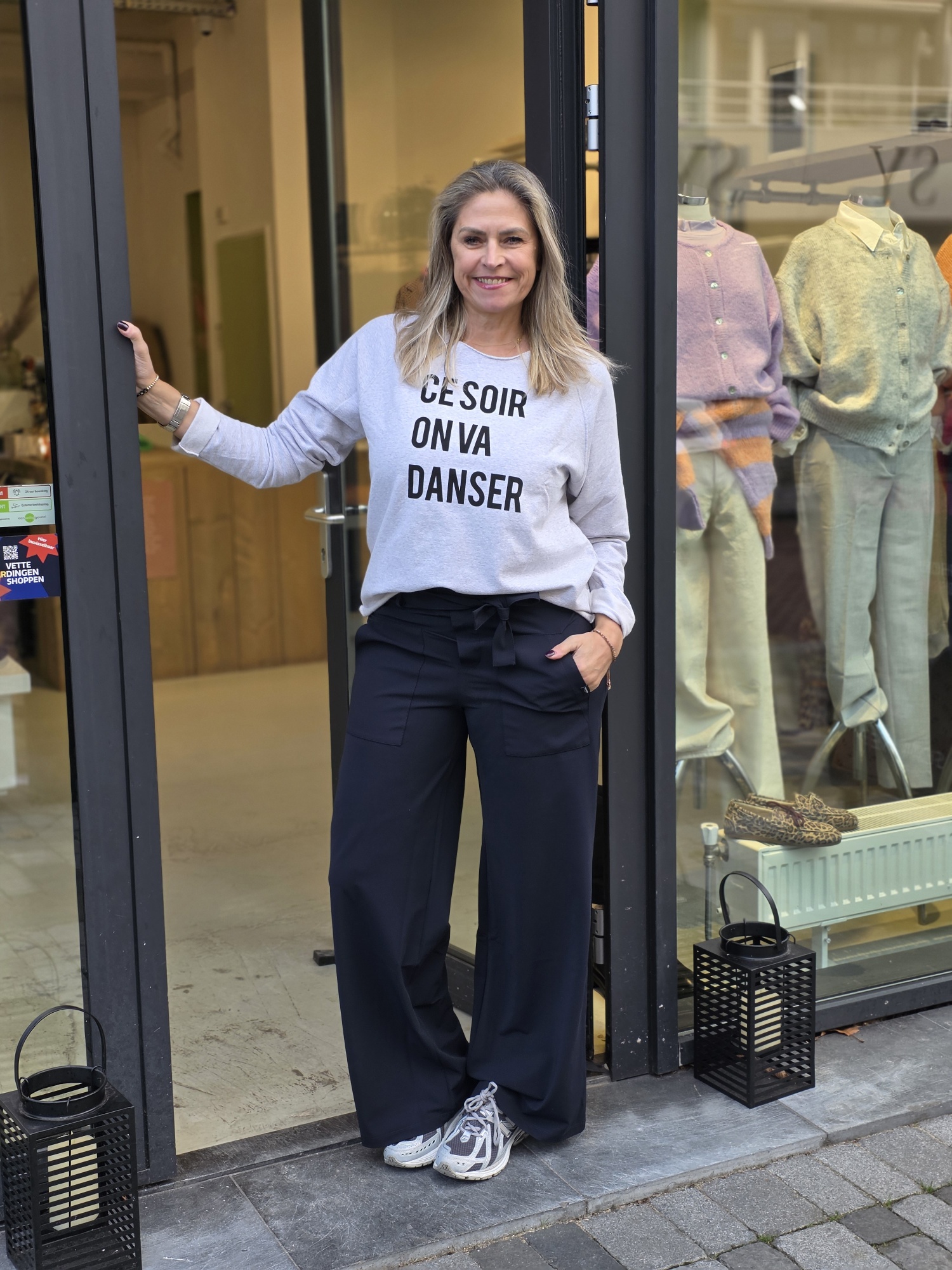Leuke sweater met tekst in zacht materiaal. Model draagt maat m.