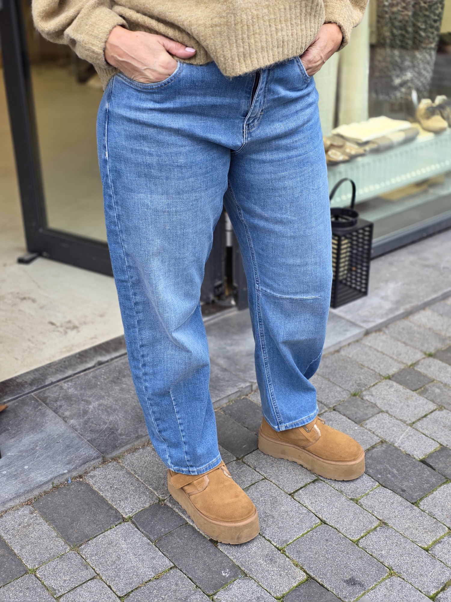 Jeans met rechte pijpen, hoge taille en vijf zakken. Opvallende naad op de knie en een strakke, gestructureerde pasvorm. Model draagt maat 30
