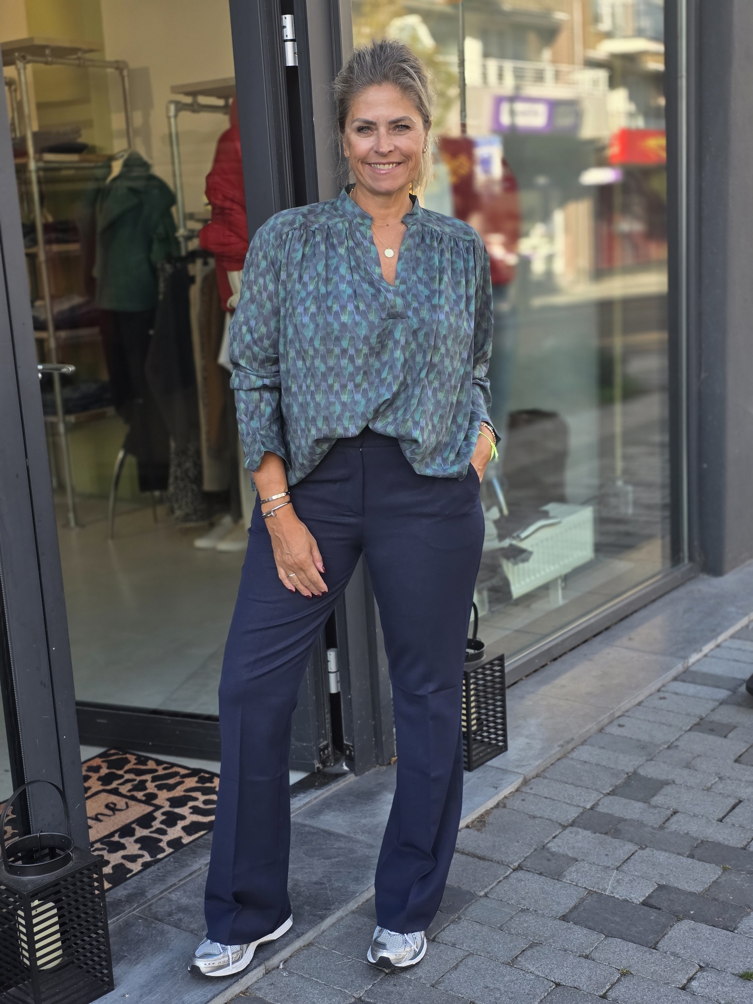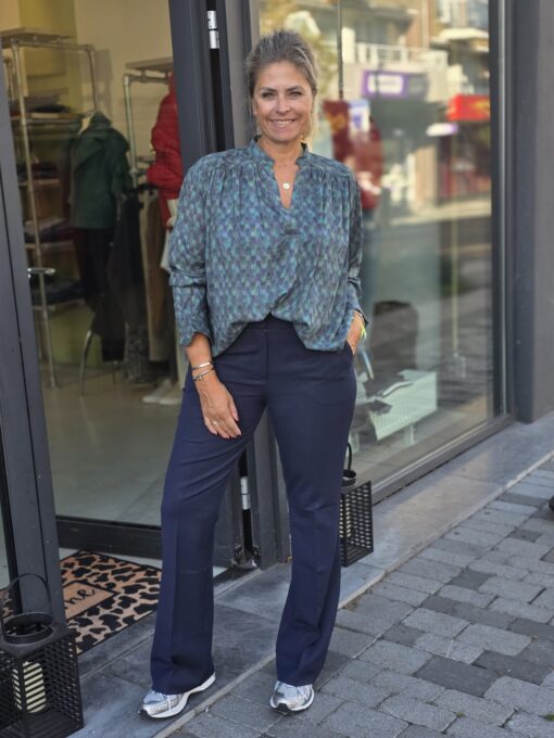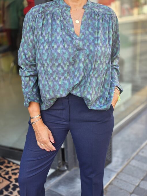 Leuke wijd model blouse met een leuke print. Model draagt maat 2 (m)