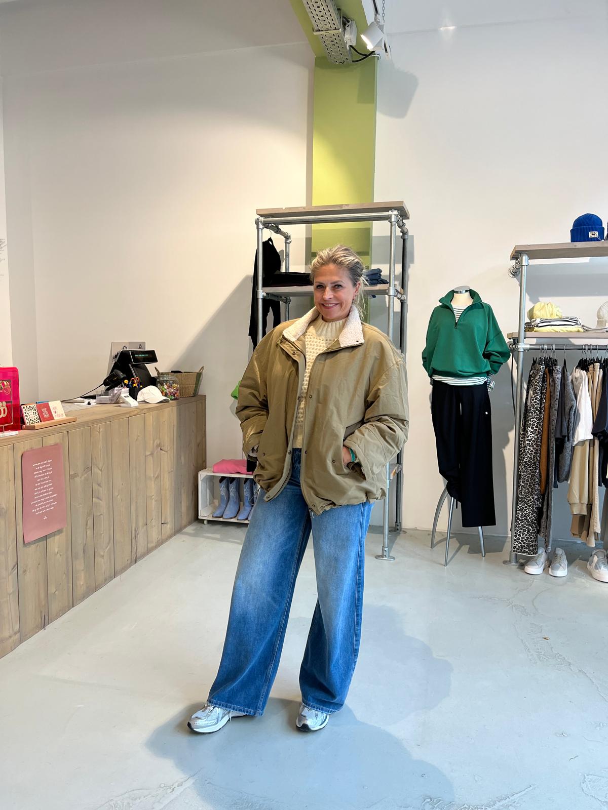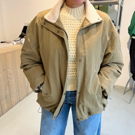 Stoere jas met teddy materiaal aan de binnenkant. Model draagt maat 2 (m)