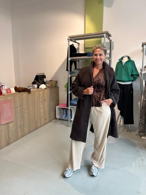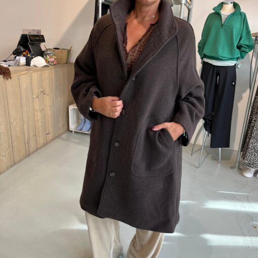 Mooie jas met knopen in een mantel model. Model draagt maat s/m.