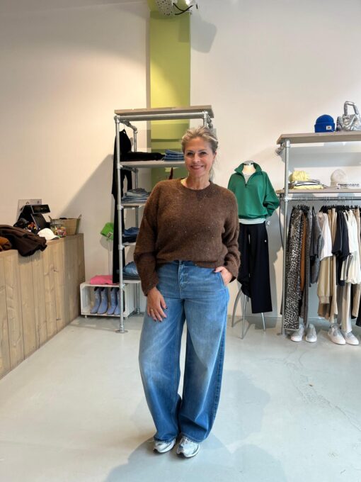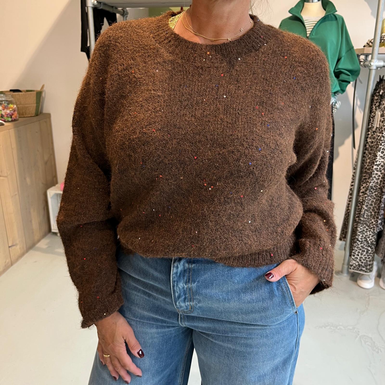 Leuke trui met kleine gekleurde pailleten. Model draagt maat s/m
