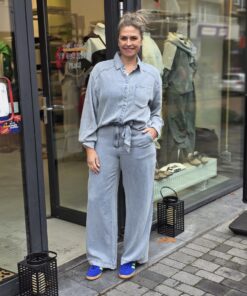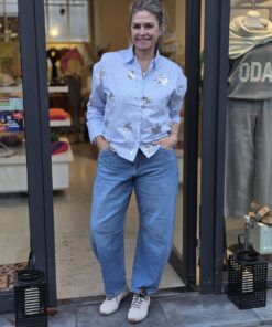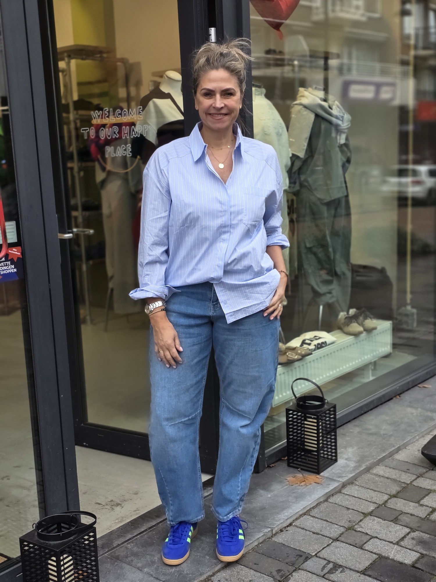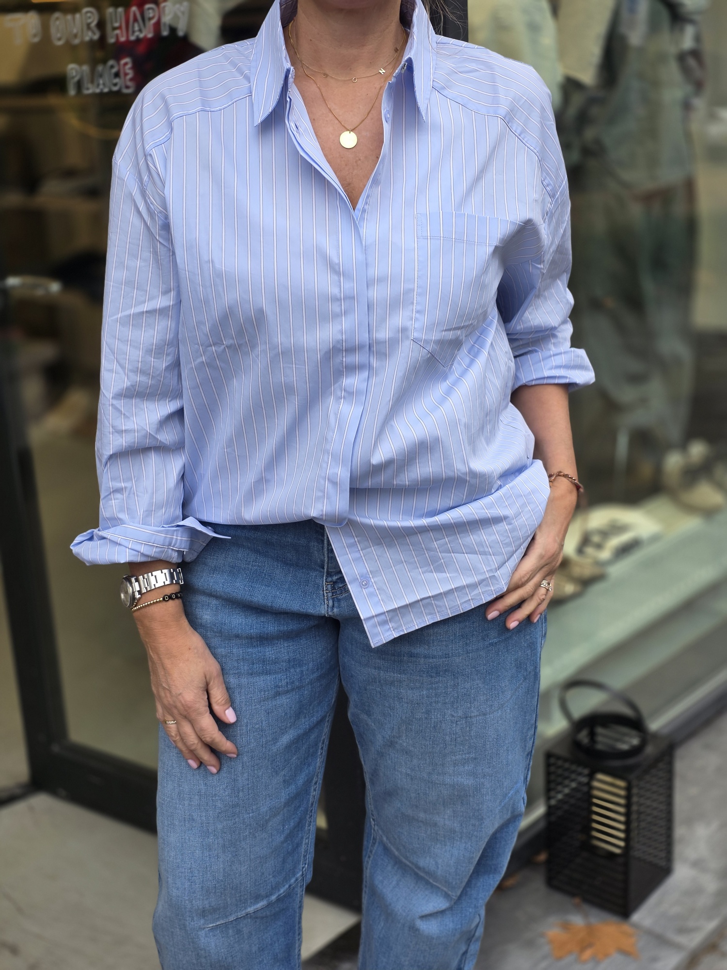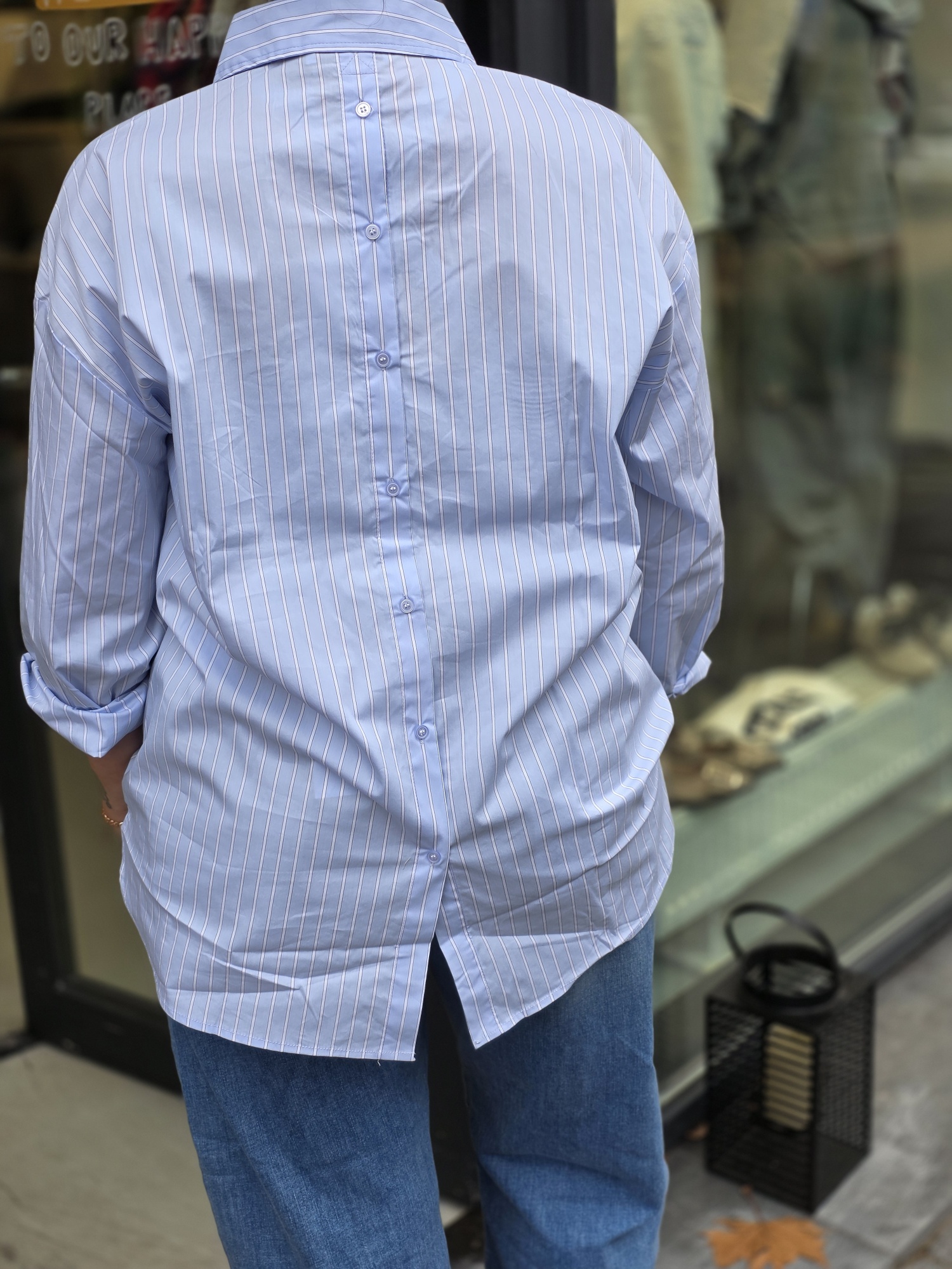 Een frisse, tijdloze blouse met een elegante gestreepte look. Gemaakt van lichte, comfortabele poplin met een gestructureerde feel. De slightly oversized fit zorgt voor een relaxed silhouet, terwijl de knoopdetails aan de achterkant een subtiele, stijlvolle twist toevoegen. Een veelzijdige essential die moeiteloos te combineren is met zowel casual denim als geklede items.