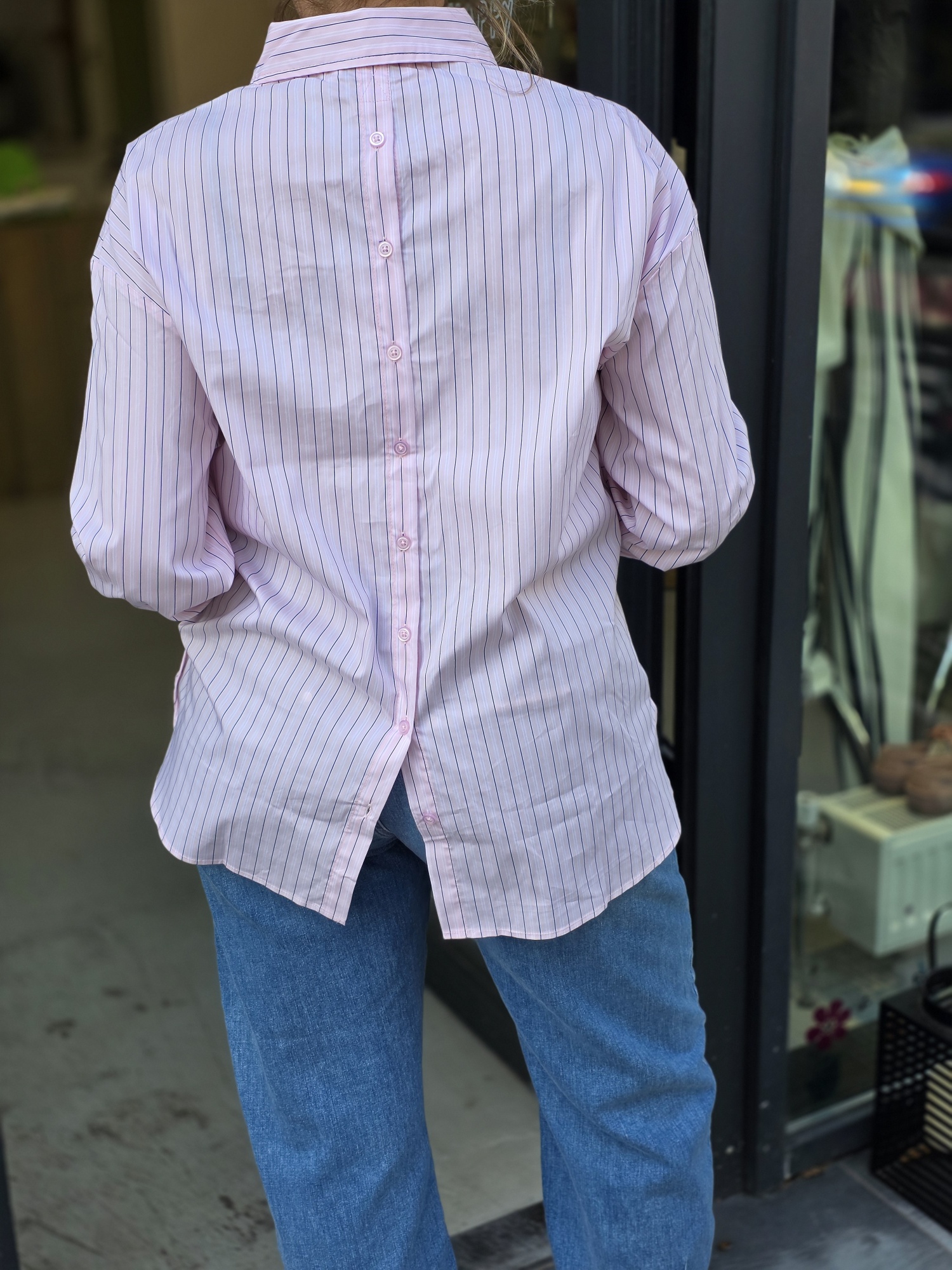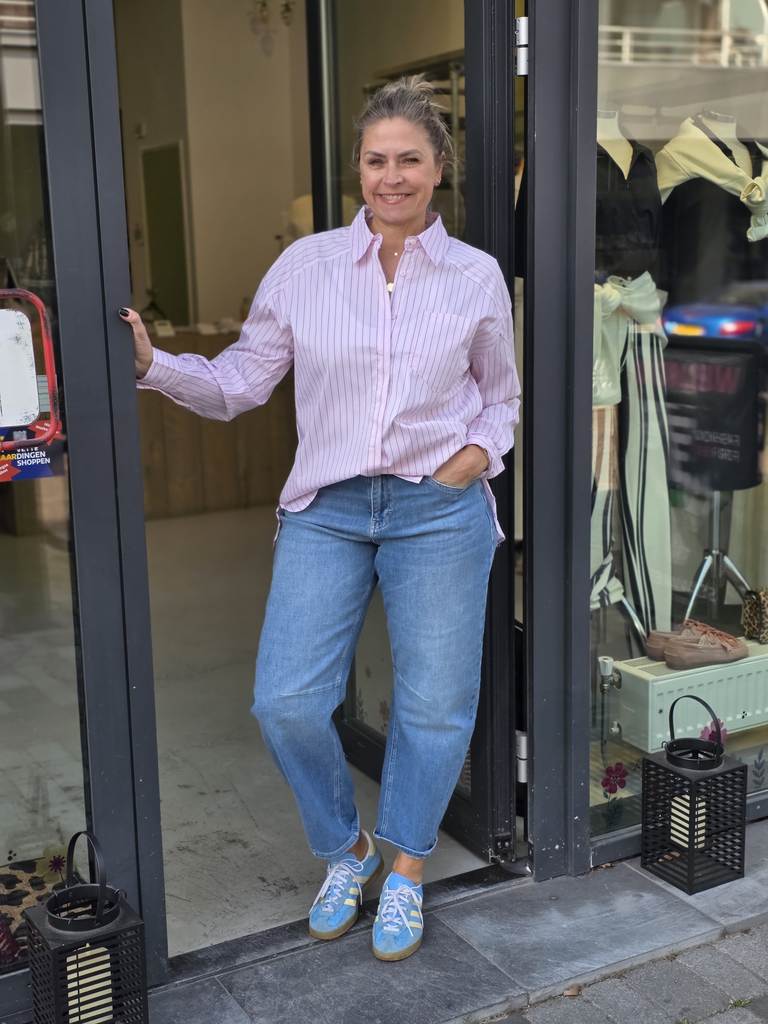 Deze blouse is uitgevoerd in een katoen-linnenblend met een subtiel streeppatroon. De lichte en ademende stof zorgt voor een comfortabel draaggevoel en een natuurlijke, zomerse uitstraling. Het rechte silhouet met cut-on mouwen geeft de blouse een moderne en minimalistische look, waardoor hij eenvoudig te combineren is met verschillende outfits.