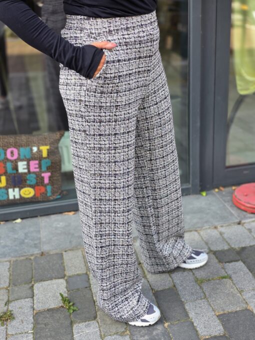 Deze stijlvolle broek combineert comfort met elegantie dankzij de zachte boucle jersey in een multi kleurige melange. De wijd uitlopende pijpen zorgen voor een flatterend silhouet, terwijl de elastische tailleband extra draagcomfort biedt. Het speelse structuureffect van de boucle jersey geeft de broek een unieke, verfijnde uitstraling. Ideaal voor zowel een relaxte dag als een verzorgde look.