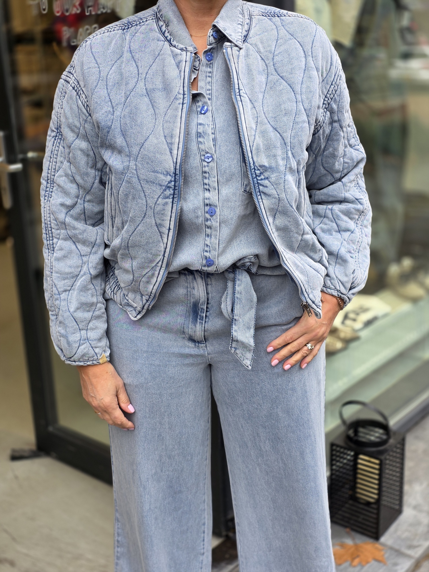 Een moderne, stijlvolle bomber met een zachte, subtiel gewassen denim look. De jas is gemaakt van hoogwaardige Tencel met twillstructuur en een lichte denim wassing voor een soepele touch en eigentijdse uitstraling. De padded, quilted afwerking geeft extra diepte, terwijl de elastische zoom en manchetten zorgen voor een comfortabele en vrouwelijke pasvorm. Een veelzijdig item dat makkelijk te combineren is met zowel casual als geklede looks.