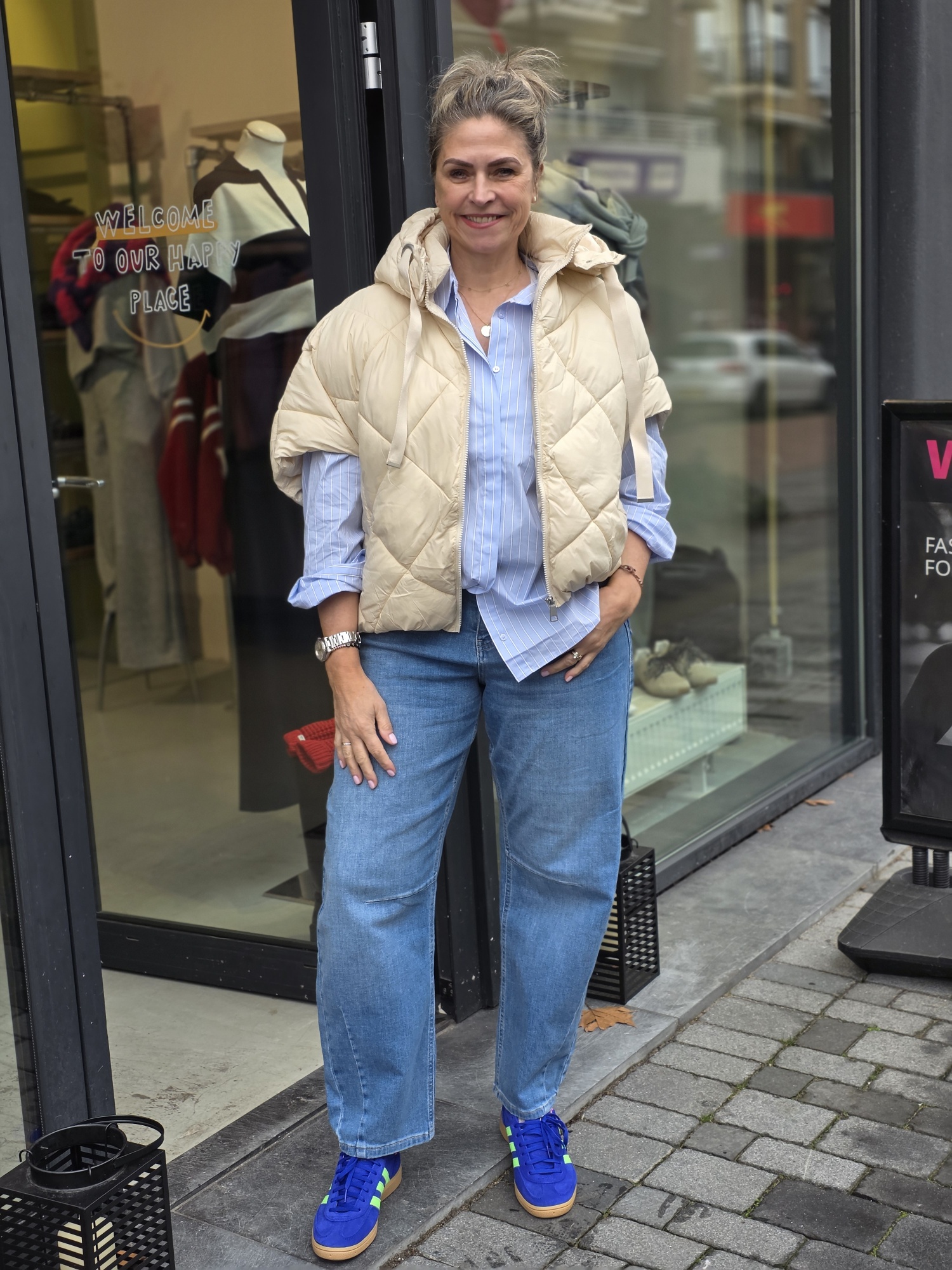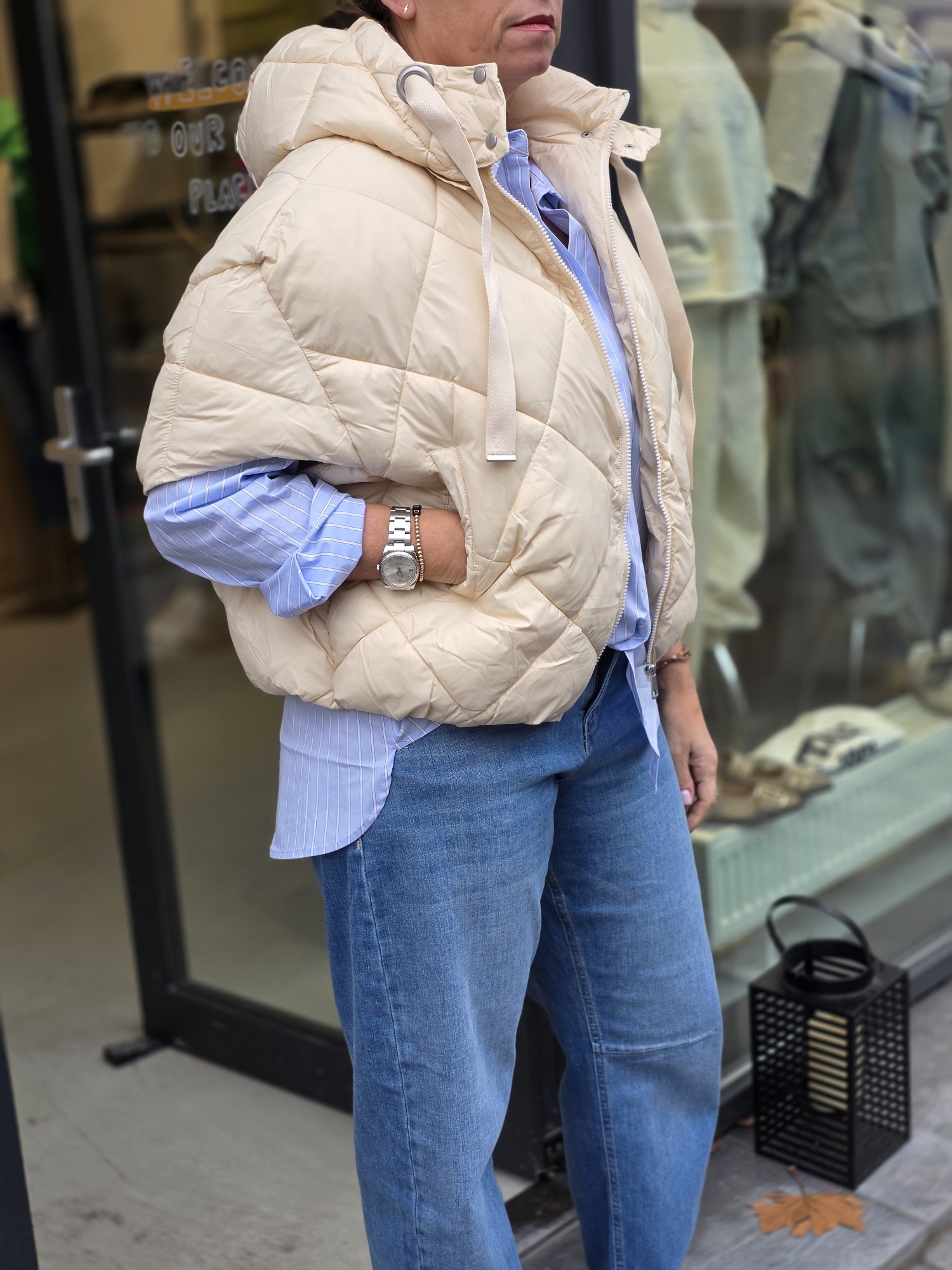 Deze gewatteerde jas is uitgevoerd in een kwalitatieve nylon kwaliteit met een zachte, lichtglanzende finish. De sleeveless bomber fit geeft het ontwerp een stoere, modieuze uitstraling, terwijl de afneembare capuchon zorgt voor extra functionaliteit en variatie in styling. Een ideaal item voor frisse dagen, perfect om te layeren over truien, blouses of knitwear.