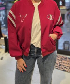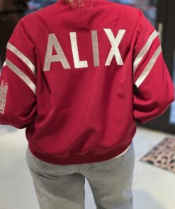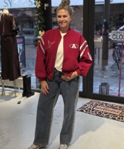 GARWIN is een kort jasje, met een knoopsluiting in het midden en twee zakken. Het jasje heeft een brede geribde elastische rand bij de polsen, taille en hals, evenals borduursels op de rug. Het model heeft maat M aan.