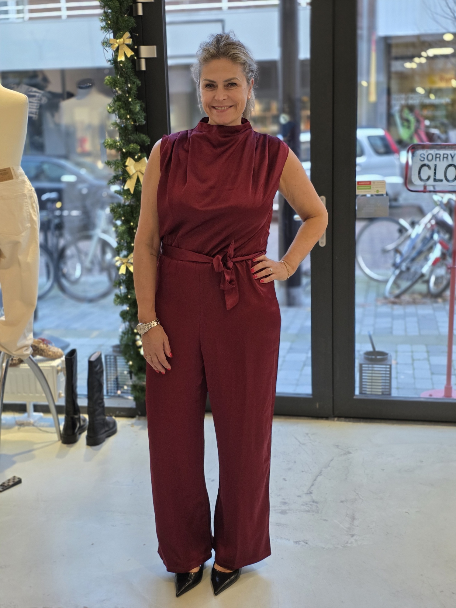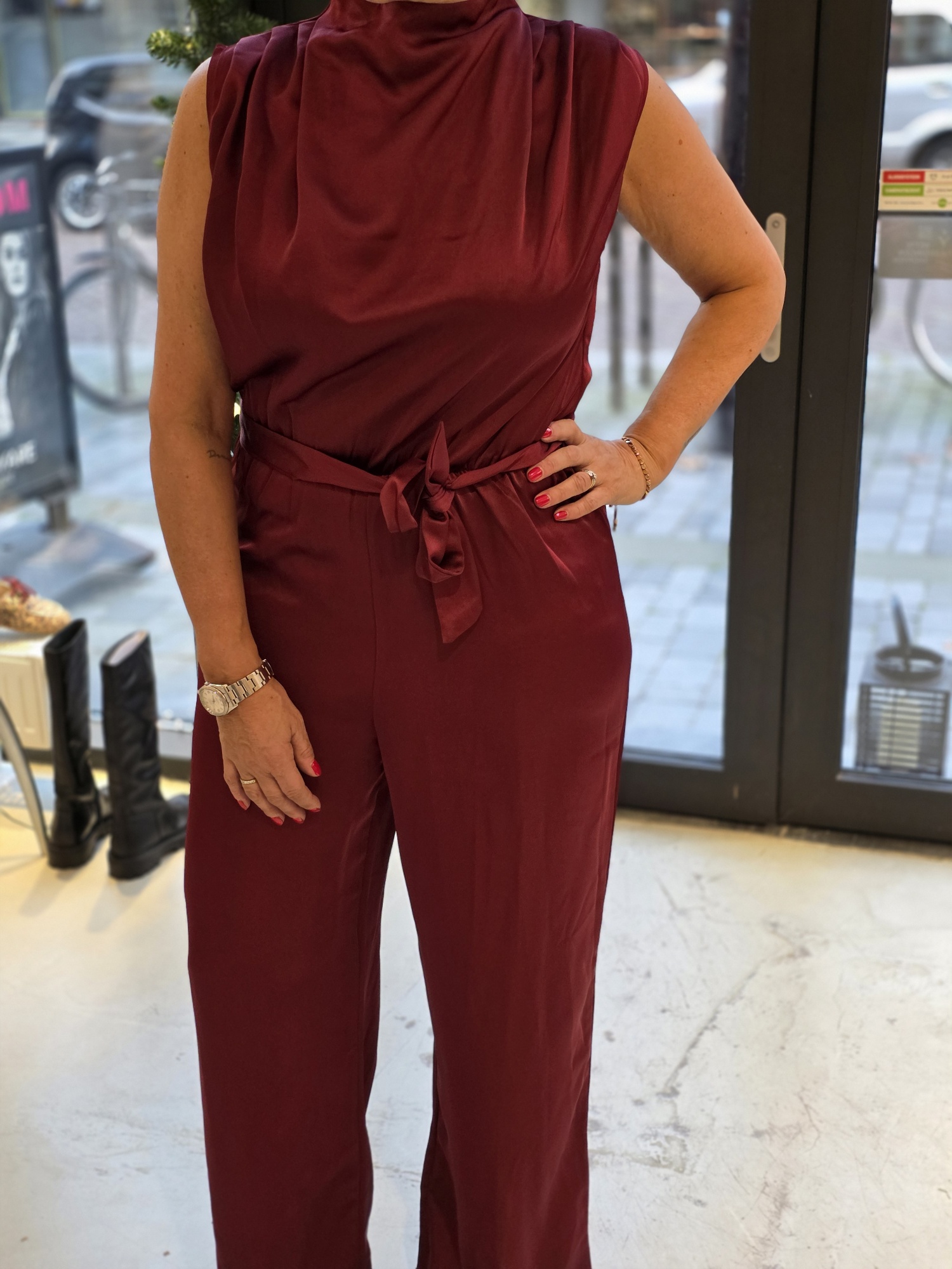 GUTO-JU4 is een elegante satijnen jumpsuit zonder mouwen. Hij heeft een afneembare stropdas rond de taille en een prachtige halslijn in de nek. Het model heeft maat M aan.